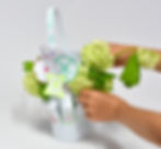 Using some Viburnum leftover from class, she placed small branches between the cutouts in the paper lantern. To ensure asymmetry, she also added a small amount of Viburnum to one side of the lantern while creating mass and line on the other.